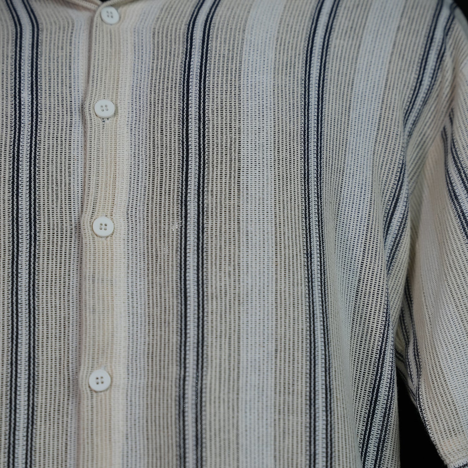 Step into style with this Striped Open-Weave Casual Shirt from Fabure. Crafted from a lightweight, breathable fabric with a unique open-weave texture, this short-sleeve shirt features a striking vertical stripe pattern in white and grey tones. Perfect for warm weather, its button-down front and relaxed fit offer both comfort and a modern aesthetic. Pair it with shorts or jeans for a chic, effortless look. Available now at Fabure!
